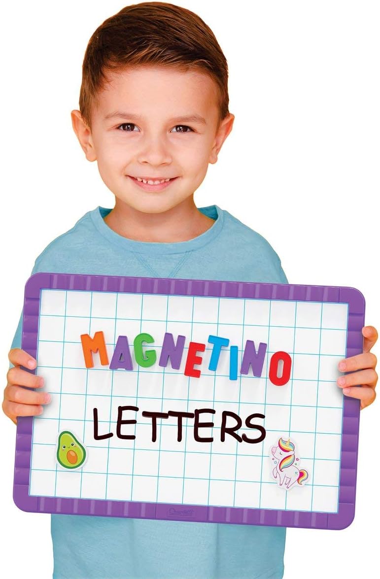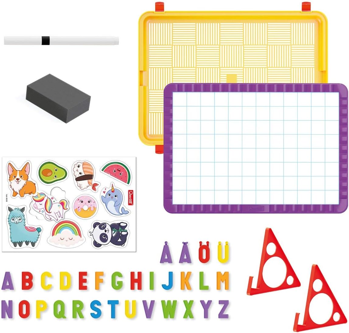 This large magnetic board from Quercetti gives your children plenty of space to let their creativity run wild. Set includes: 1 magnetic board, 1 support for displaying the board, 1 case for storing the shapes, 30 templates, 1 blackboard writing pen, 1 sponge 48 magnetic letters. Assembled, the board can be carried like a suitcase and can be easily transported. Board Size: 38 x 27 cm