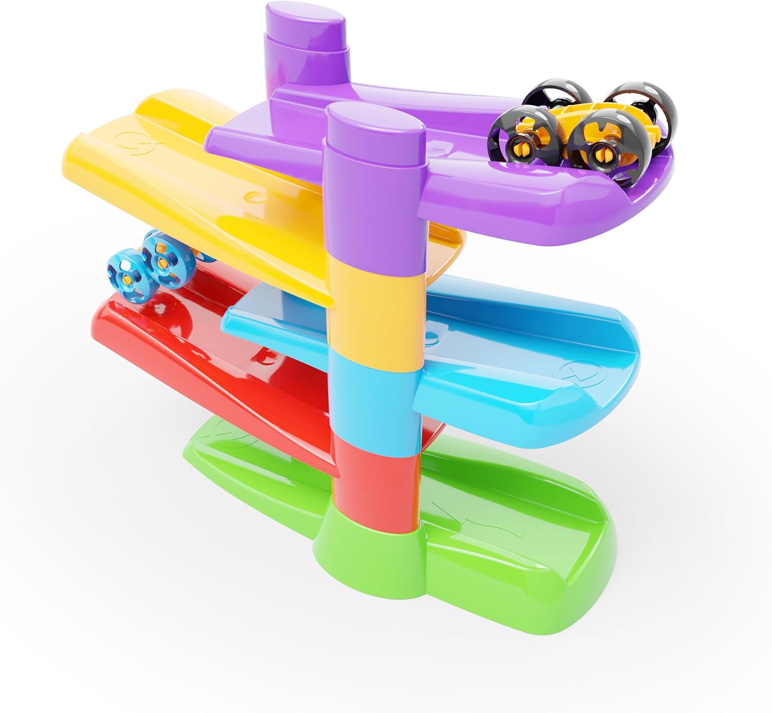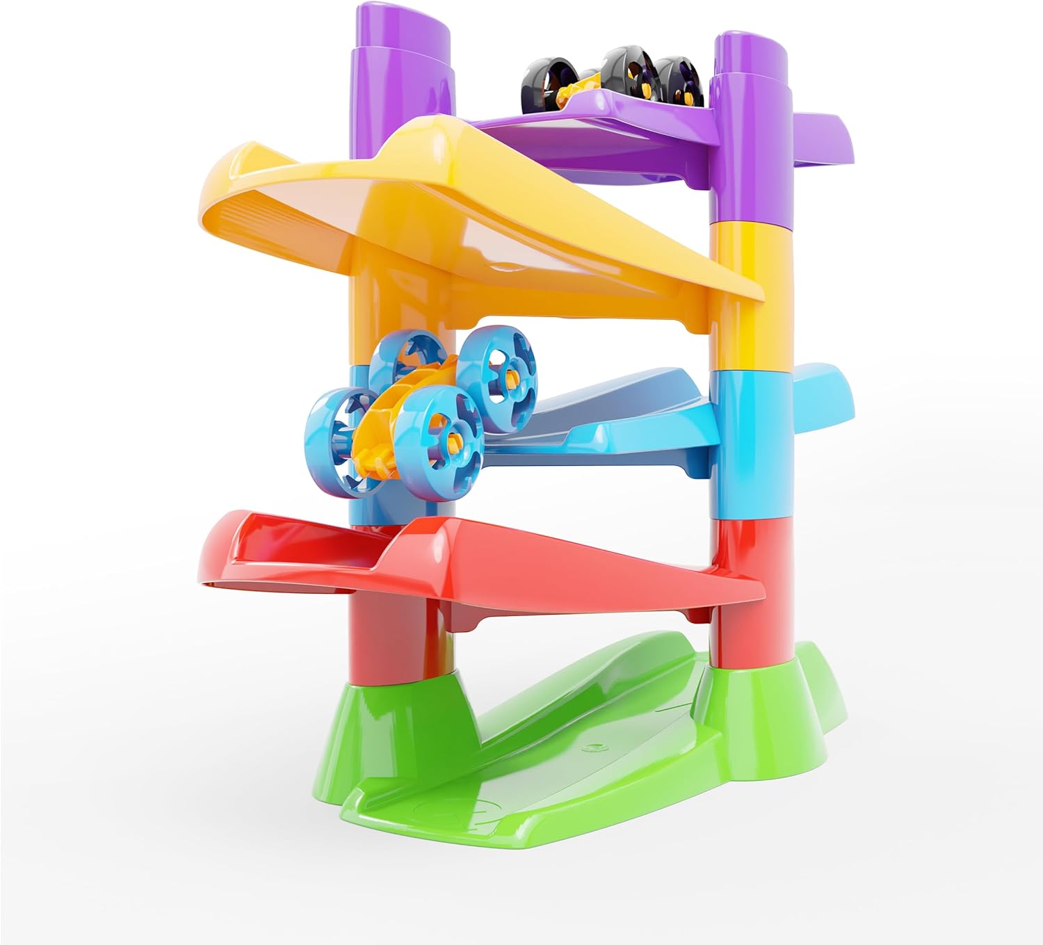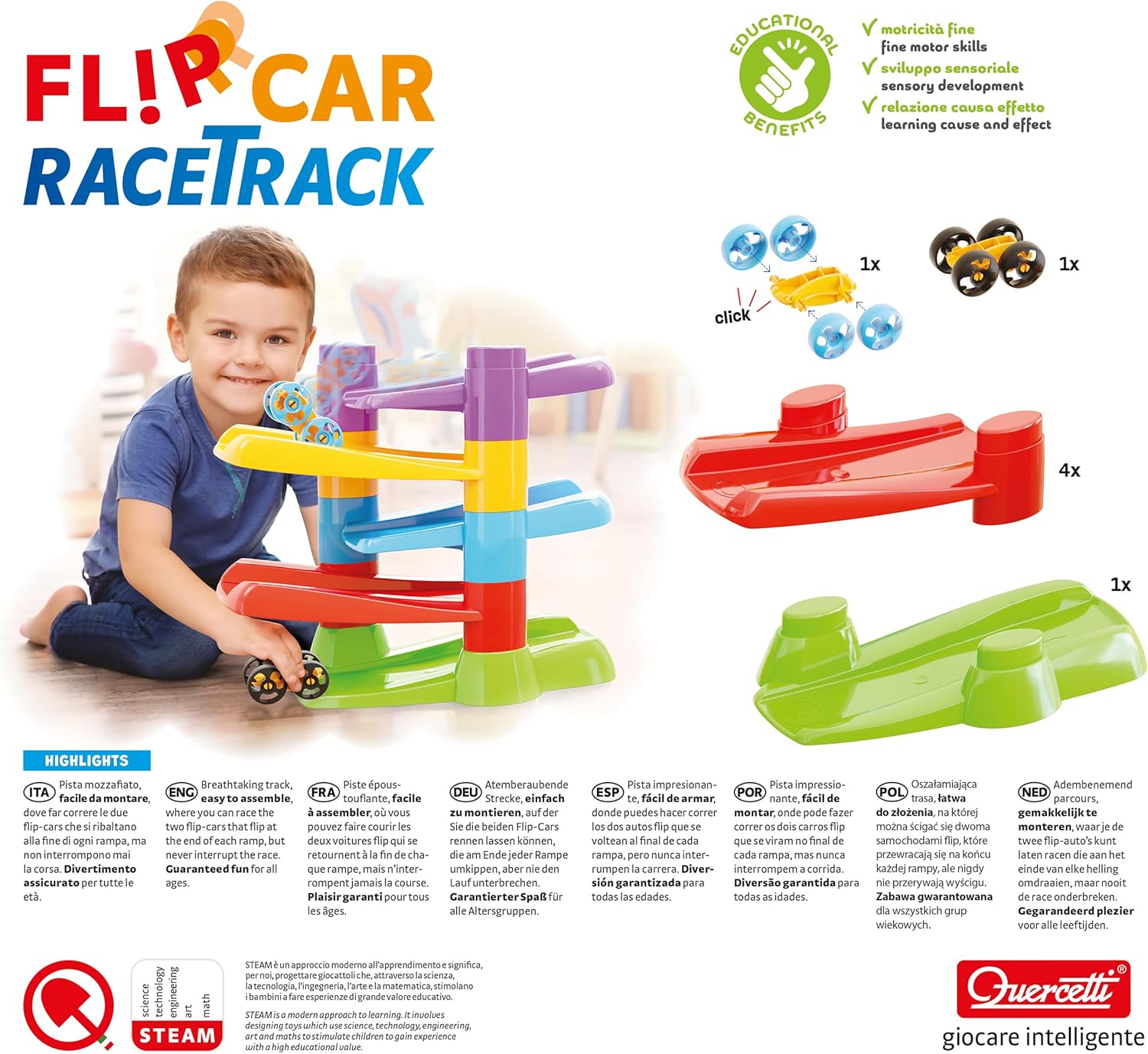 FLIP CAR RACE TRACK PLAYSET is an exciting and dynamic racing toy designed for children ages 18 months and up. This breathtaking track is easy to assemble and provides endless fun as the included two flip-cars race down the ramps, flipping at the end of each track and continuing without interruption. Designed to captivate and engage young minds, this playset enhances hand-eye coordination, cause-and-effect learning, and fine motor skills as toddlers watch their cars zoom and flip in an endless loop. The simple yet fascinating design encourages independent play and problem-solving, making it a great introduction to motion and gravity-based play. Made from durable, child-safe materials, this Made in Italy race track playset is built to withstand hours of enthusiastic play while ensuring safety and fun. With two included toy cars, kids can race against a friend or play solo, making it an exciting and engaging toy for early childhood development.